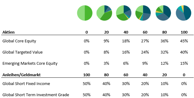 Durch die unter “Portfoliokonstruktion” dargestellten Schritte haben wir auf Anlageklassenebene eine Gruppe von Portfolioallokationen erstellt. Diesen Allokationen werden im nächsten Schritt bestimmte Fonds zugeordnet, welche die Renditen der Anlageklasse bestmöglich erfassen. Im Rahmen unserer Modellportfolios arbeiten wir eng mit dem Assetmanager Dimensional Fund Advisors Ltd. (im Folgenden „Dimensional“) zusammen, der unsere Investmentphilosophie teilt und durch umsichtige Konstruktion und Verwaltung der Fonds bestrebt ist, die Wertentwicklung des Marktes zu übertreffen, ohne dabei mögliche zukünftige Marktentwicklungen vorhersagen zu müssen.